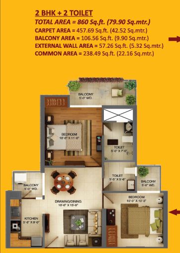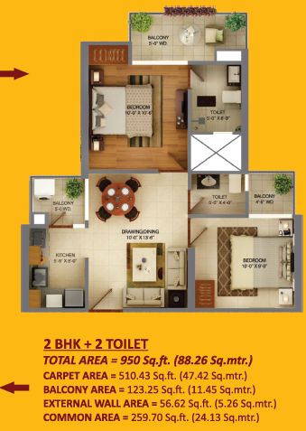 950 Sq.ft. | 2 BHK | 2 Bath(s)