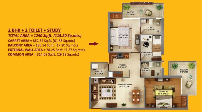 1240 Sq.ft. | 2 BHK | 2 Bath(s)