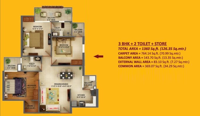 1360 Sq.ft. | 3 BHK | 2 Bath(s)