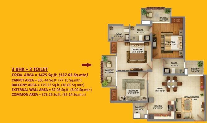 1475 Sq.ft. | 3 BHK | 3 Bath(s)